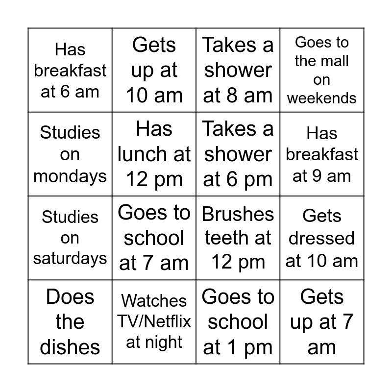 This bingo card has 16 words: Watches TV/Netflix at night, Gets dressed at 10 am, Takes a shower at 8 am, Has breakfast at 6 am, Studies on saturdays, Gets up at 10 am, Brushes teeth at 12 pm, Goes to school at 1 pm, Studies on mondays, Has lunch at 12 pm, Does the dishes, Goes to the mall on weekends, Goes to school at 7 am, Has breakfast at 9 am, Takes a shower at 6 pm and Gets up at 7 am.
