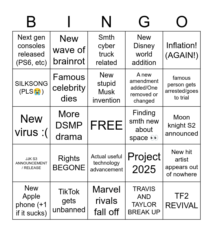 This bingo card has a free space and 24 words: Rights BEGONE, TikTok gets unbanned, New stupid Musk invention, New Apple phone (+1 if it sucks), Inflation! (AGAIN!), Next gen consoles released (PS6, etc), SILKSONG (PLSðŸ˜), New wave of brainrot, Finding smth new about space 👀, Actual useful technology advancement, A new amendment added/One removed or changed, New virus :(, Project 2025, New hit artist appears out of nowhere, Famous celebrity dies, TRAVIS AND TAYLOR BREAK UP, Moon knight S2 announced, Smth cyber truck related, famous person gets arrested/goes to trial, More DSMP drama, TF2 REVIVAL, JJK S3 ANNOUNCEMENT / RELEASE, New Disney world addition and Marvel rivals fall off.