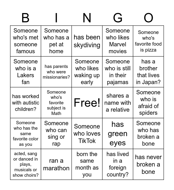 This bingo card has a free space and 63 words: Someone who has siblings, Someone who has been out of state, Someone with the same birthday month as you, Someone who has broken a bone, Someone who plays sports, Someone who wears glasses, Someone who has a pet at home, Some who is left-handed, Someone who likes waking up early, Someone who loves playing video games, Someone who loves TikTok, Someone who's an only child, Someone who is afraid of spiders, Someone who's favorite food is pizza, Someone who likes to dance, Someone who is a Lakers fan, Someone who's favorite subject is Math, Someone who's met someone famous, Someone who ate breakfast this morning, Someone who is still in their pajamas, Someone who can sing or rap, Someone who has the same favorite color as you, Someone who likes Marvel movies, Someone who is an only child, hasn't had breakfast today, does not like ice cream, wears socks to bed, has the most letters in their last name, can use chopsticks, speaks 3 languages?, graduates from high school this year?, has a son who is a champion hurdle jumper?, is the youngest member of our church?, has a son is a weight lifting champion?, has a brother that lives in Japan?, acted, sang or danced in plays, musicals or show choirs?, is a world-renowned psychologist?, has lived in a foreign country?, has adopted children?, has parents who were missionaries?, has worked with autistic children?, shares a name with a relative, is left-handed, prefers Pepsi over coke, has never broken a bone, ran a marathon, has been on a cruise, has green eyes, currently owns a pet other than a cat or dog, has piloted a plane, homeschool mom, born the same month as you, can whistle with their fingers, exercises regularly, has never had a cavity, has been skydiving, has shaken a president's hand, knows a magic trick, has a hidden talent, is not on social media, has won a contest, has a Bible and has hosted an exchange student.