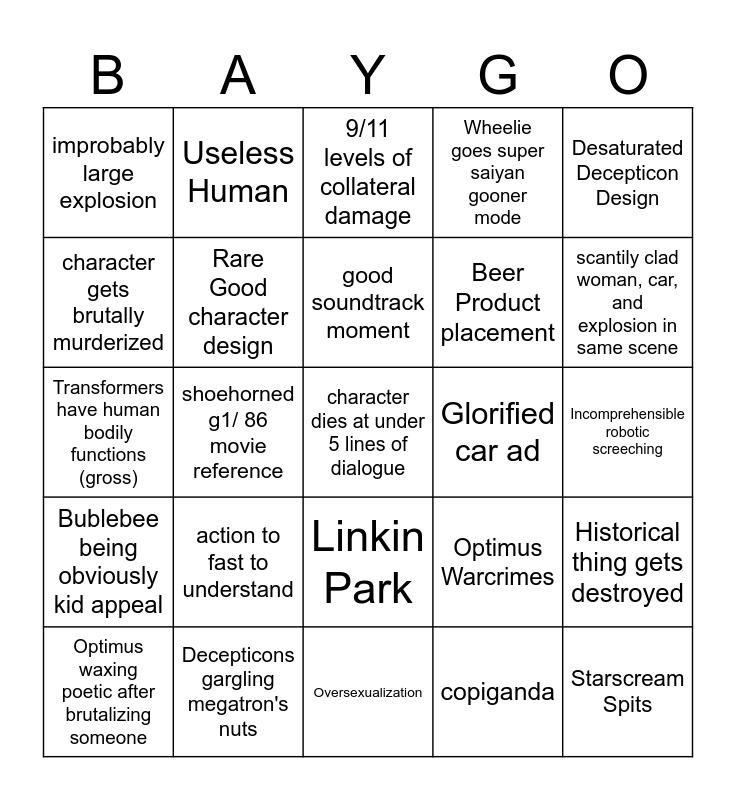 This bingo card has 27 words: Optimus Warcrimes, Starscream Spits, Beer Product placement, Oversexualization, character gets brutally murderized, 9/11 levels of collateral damage, Useless Human, Bublebee being obviously kid appeal, Glorified car ad, Historical thing gets destroyed, Transformers have human bodily functions (gross), Wheelie goes super saiyan gooner mode, Optimus waxing poetic after brutalizing someone, Decepticons gargling megatron's nuts, scantily clad woman, car, and explosion in same scene, People looking uncharacteristically dirty/sweaty, Rare Good character design, good soundtrack moment, action to fast to understand, improbably large explosion, Incomprehensible robotic screeching, copiganda, shoehorned g1/ 86 movie reference, character dies at under 5 lines of dialogue, Linkin Park, Desaturated Decepticon Design and Morally questionable opinion stated as fact.