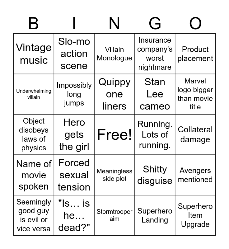 This bingo card has a free space and 24 words: Forced sexual tension, "Is… is he… dead?", Quippy one liners, Seemingly good guy is evil or vice versa, Product placement, Vintage music, Underwhelming villain, Slo-mo action scene, Running. Lots of running., Meaningless side plot, Stan Lee cameo, Object disobeys laws of physics, Shitty disguise, Avengers mentioned, Impossibly long jumps, Superhero Landing, Collateral damage, Villain Monologue, Marvel logo bigger than movie title, Hero gets the girl, Superhero Item Upgrade, Name of movie spoken, Insurance company's worst nightmare and Stormtrooper aim.