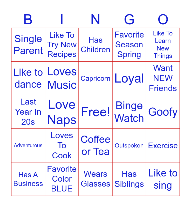 This bingo card has a free space and 24 words: Has A Business, Loves To Cook, Capricorn, Has Siblings, Like To Learn New Things, Single Parent, Like To Try New Recipes, Has Children, Binge Watch, Goofy, Last Year In 20s, Loves Music, Outspoken, Exercise, Like to dance, Favorite Color BLUE, Wears Glasses, Favorite Season Spring, Want NEW Friends, Adventurous, Love Naps, Coffee or Tea, Loyal and Like to sing.