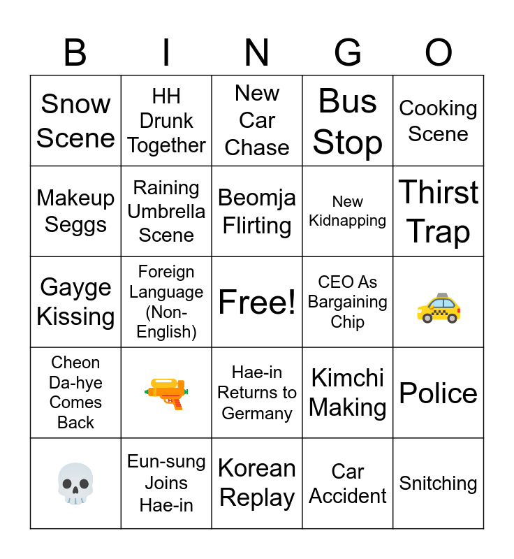 This bingo card has a free space and 24 words: 🔫, Eun-sung Joins Hae-in, Beomja Flirting, 💀, Cooking Scene, Snow Scene, Makeup Seggs, HH Drunk Together, CEO As Bargaining Chip, Hae-in Returns to Germany, New Kidnapping, Gayge Kissing, Kimchi Making, Police, Raining Umbrella Scene, Car Accident, 🚕, New Car Chase, Thirst Trap, Foreign Language (Non-English), Snitching, Cheon Da-hye Comes Back, Bus Stop and Korean Replay.