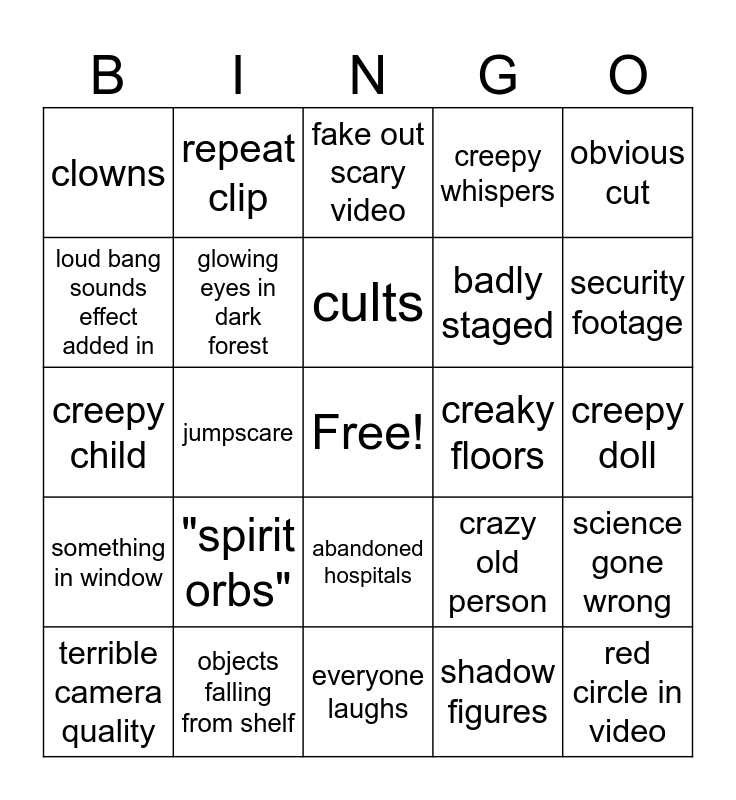 This bingo card has a free space and 24 words: "spirit orbs", objects falling from shelf, cults, terrible camera quality, obvious cut, clowns, loud bang sounds effect added in, repeat clip, creaky floors, abandoned hospitals, badly staged, creepy child, crazy old person, science gone wrong, glowing eyes in dark forest, shadow figures, creepy doll, fake out scary video, security footage, jumpscare, red circle in video, something in window, creepy whispers and everyone laughs.