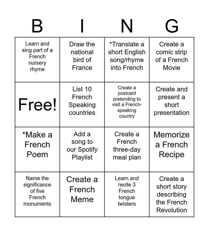 This bingo card has 16 words: Create a French Meme, Memorize a French Recipe, *Translate a short English song/rhyme into French, Learn and sing part of a French nursery rhyme, *Make a French Poem, Draw the national bird of France, Create a French three-day meal plan, Learn and recite 3 French tongue twisters, Free!, List 10 French Speaking countries, Name the significance of five French monuments, Create a comic strip of a French Movie, Add a song to our Spotify Playlist, Create and present a short presentation, Create a postcard pretending to visit a French-speaking country and Create a short story describing the French Revolution.