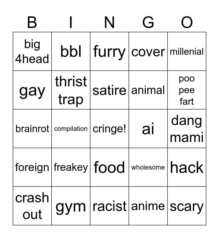 This bingo card has a free space and 24 words: freakey, gym, satire, crash out, millenial, big 4head, gay, bbl, ai, food, animal, brainrot, wholesome, hack, thrist trap, anime, dang mami, furry, poo pee fart, compilation, scary, foreign, cover and racist.