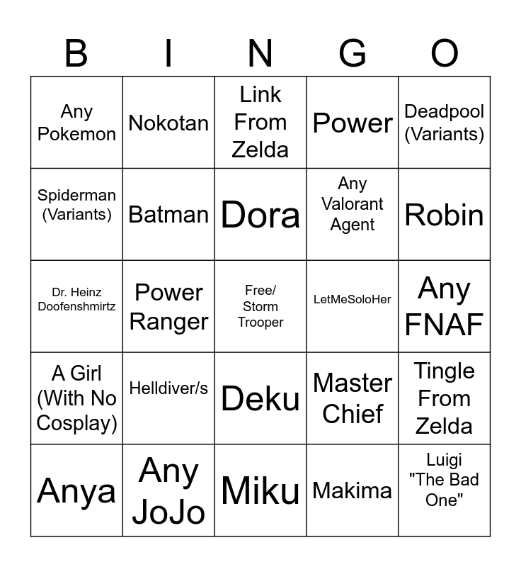 This bingo card has a free space and 24 words: Helldiver/s, Any JoJo, Dora, Anya, Deadpool (Variants), Any Pokemon, Spiderman (Variants), Nokotan, LetMeSoloHer, Deku, Any Valorant Agent, Dr. Heinz Doofenshmirtz, Master Chief, Tingle From Zelda, Batman, Makima, Any FNAF, Link From Zelda, Robin, Power Ranger, Luigi "The Bad One", A Girl (With No Cosplay), Power and Miku.