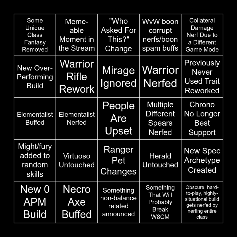 This bingo card has a free space and 24 words: Virtuoso Untouched, Necro Axe Buffed, Mirage Ignored, New 0 APM Build, Collateral Damage Nerf Due to a Different Game Mode, Some Unique Class Fantasy Removed, New Over-Performing Build, Meme-able Moment in the Stream, Multiple Different Spears Nerfed, Ranger Pet Changes, Warrior Nerfed, Elementalist Buffed, Herald Untouched, New Spec Archetype Created, Warrior Rifle Rework, Something That Will Probably Break W8CM, Chrono No Longer Best Support, "Who Asked For This?" Change, Previously Never Used Trait Reworked, Elementalist Nerfed, Obscure, hard-to-play, highly-situational build gets nerfed by nerfing entire class, Might/fury added to random skills, WvW boon corrupt nerfs/boon spam buffs and Something non-balance related announced.