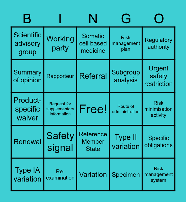 This bingo card has a free space and 40 words: Product information, Product-specific waiver, Protocol assistance, Rapporteur, Re-examination, Reference Member State, Referral, Reflection paper, Regulatory authority, Renewal, Request for supplementary information, Risk management plan, Risk management system, Risk minimisation activity, Route of administration, Safety signal, Scientific advice, Scientific advisory group, Serious adverse reaction, Somatic cell based medicine, Specific obligations, Specimen, Subgroup analysis, Summary of opinion, Summary of product characteristics, Sunset clause, Supplementary protection certificate, Third country, Tissue-engineered product, Transfer of marketing authorisation, Trial protocol, Type IA variation, Type IB variation, Type II variation, Urgent safety restriction, Variation, Well-established use, Withdrawal period, Working party and Worksharing.
