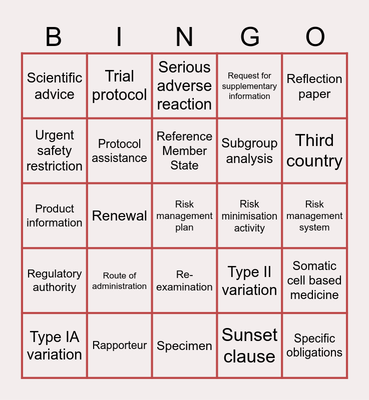 This bingo card has 41 words: Free!, Product information, Product-specific waiver, Protocol assistance, Rapporteur, Re-examination, Reference Member State, Referral, Reflection paper, Regulatory authority, Renewal, Request for supplementary information, Risk management plan, Risk management system, Risk minimisation activity, Route of administration, Safety signal, Scientific advice, Scientific advisory group, Serious adverse reaction, Somatic cell based medicine, Specific obligations, Specimen, Subgroup analysis, Summary of opinion, Summary of product characteristics, Sunset clause, Supplementary protection certificate, Third country, Tissue-engineered product, Transfer of marketing authorisation, Trial protocol, Type IA variation, Type IB variation, Type II variation, Urgent safety restriction, Variation, Well-established use, Withdrawal period, Working party and Worksharing.