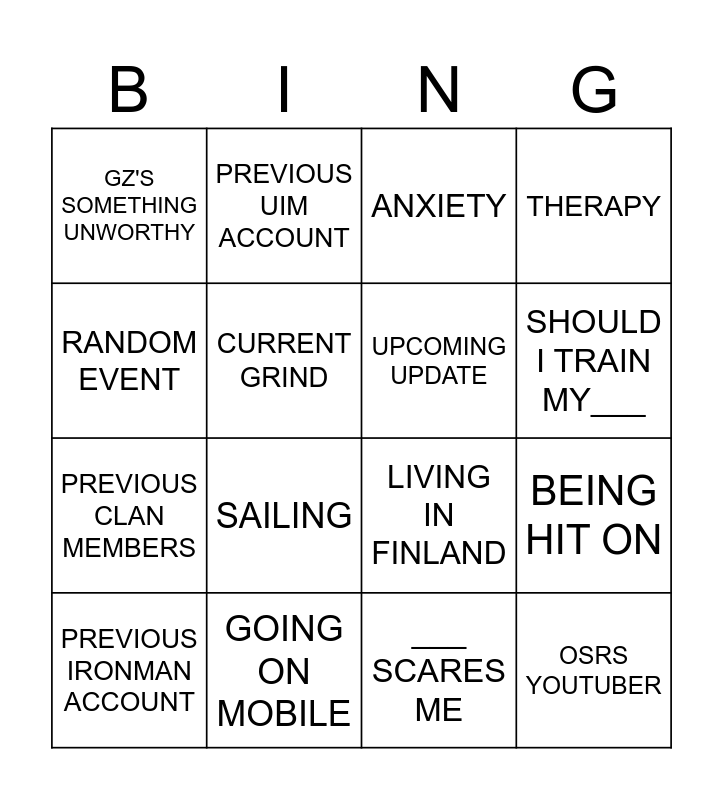 This bingo card has 16 words: GOING ON MOBILE, BEING HIT ON, ANXIETY, GZ'S SOMETHING UNWORTHY, PREVIOUS CLAN MEMBERS, PREVIOUS UIM ACCOUNT, LIVING IN FINLAND, ___ SCARES ME, RANDOM EVENT, CURRENT GRIND, PREVIOUS IRONMAN ACCOUNT, THERAPY, SAILING, SHOULD I TRAIN MY___, UPCOMING UPDATE and OSRS YOUTUBER.