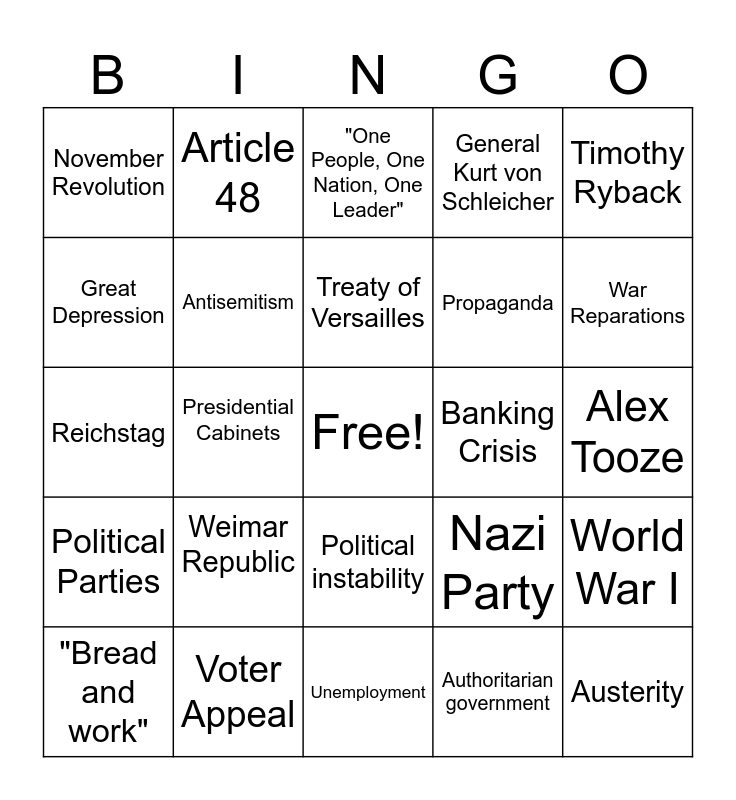 This bingo card has a free space and 24 words: Weimar Republic, Voter Appeal, Treaty of Versailles, "Bread and work", Timothy Ryback, November Revolution, Great Depression, Article 48, Banking Crisis, Political instability, Propaganda, Reichstag, Nazi Party, World War I, Antisemitism, Authoritarian government, Alex Tooze, "One People, One Nation, One Leader", War Reparations, Presidential Cabinets, Austerity, Political Parties, General Kurt von Schleicher and Unemployment.