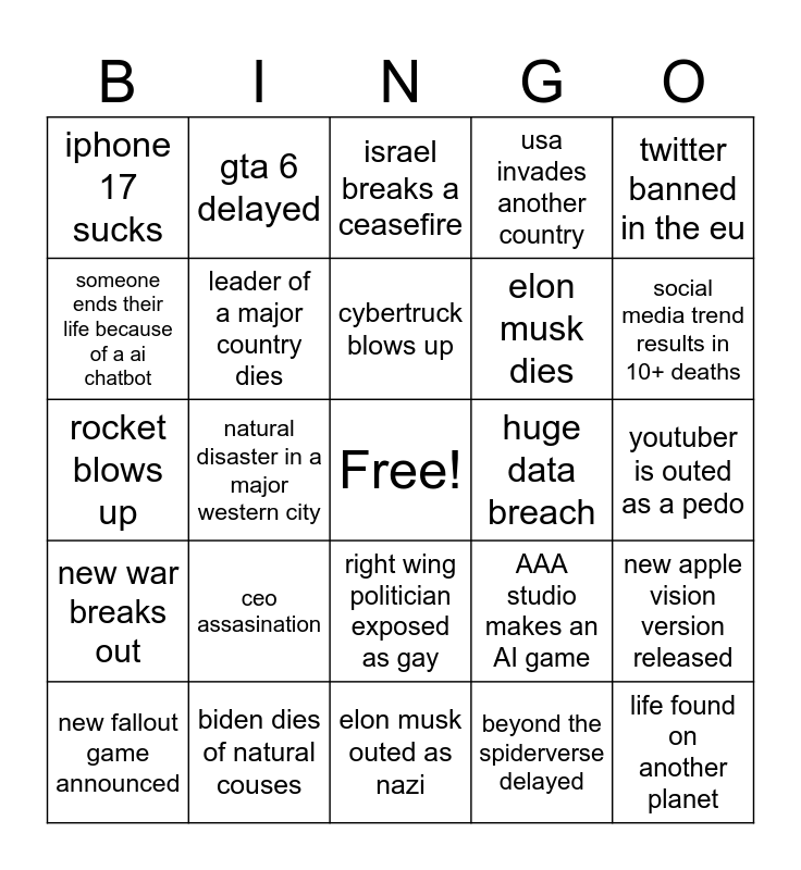 This bingo card has a free space and 24 words: ceo assasination, biden dies of natural couses, cybertruck blows up, new fallout game announced, twitter banned in the eu, iphone 17 sucks, someone ends their life because of a ai chatbot, gta 6 delayed, huge data breach, right wing politician exposed as gay, elon musk dies, rocket blows up, AAA studio makes an AI game, new apple vision version released, leader of a major country dies, beyond the spiderverse delayed, youtuber is outed as a pedo, israel breaks a ceasefire, social media trend results in 10+ deaths, natural disaster in a major western city, life found on another planet, new war breaks out, usa invades another country and elon musk outed as nazi.