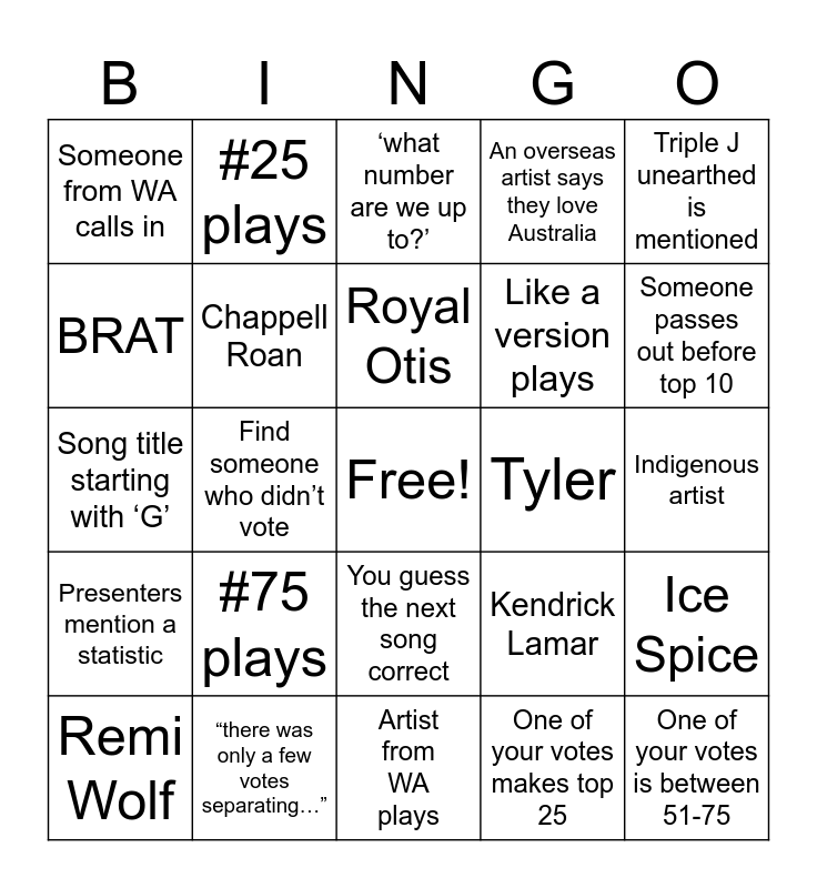 This bingo card has a free space and 53 words: One of your votes is between 76-100, One of your votes is between 51-75, One of your votes is between 26-50, One of your votes makes top 25, #75 plays, #50 plays, #25 plays, #69 plays, BRAT, Billie Eilish, Chappell Roan, Fred again…, Ice Spice, Kendrick Lamar, Rufus, Remi Wolf, Royal Otis, Tyler, Flume’s absence mentioned, Triple J unearthed is mentioned, Find someone who didn’t vote, Hotline someone says ‘yew’, Like a version plays, Someone from WA calls in, You’re disappointed about a ranking, “there was only a few votes separating…”, Someone vomits, Drunk caller, Someone cries, Someone passes out before top 10, Someone breaks something, 5 or more of your votes are played, 5 Aussie artists played consecutively, Find someone who voted for a like a version, An artist thanks the voters, Total amount of votes mentioned, An overseas artist says they love Australia, Artist from WA plays, ‘what number are we up to?’, ‘I forgot about this song’, Song you’ve never heard plays, Language warning, Indigenous artist, Same artist plays 2x, Same artist plays 3x, You guess the next song correct, You guess the next song WRONG, Song title starting with ‘A’, Song title starting with ‘G’, Presenters mention a statistic, You voted for multiple songs by the same artist, ‘I was going to vote for this’ and Someone here puts up an Instagram story.
