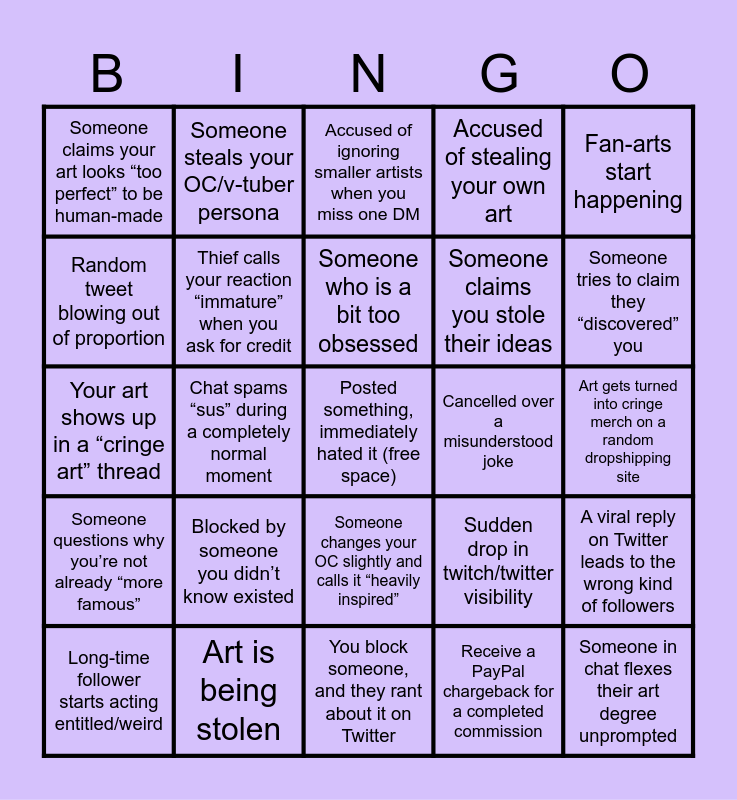 This bingo card has a free space and 24 words: Blocked by someone you didn’t know existed, Art is being stolen, Someone who is a bit too obsessed, Long-time follower starts acting entitled/weird, Fan-arts start happening, Someone claims your art looks “too perfect” to be human-made, Random tweet blowing out of proportion, Someone steals your OC/v-tuber persona, Cancelled over a misunderstood joke, Someone changes your OC slightly and calls it “heavily inspired”, Someone claims you stole their ideas, Your art shows up in a “cringe art” thread, Sudden drop in twitch/twitter visibility, A viral reply on Twitter leads to the wrong kind of followers, Thief calls your reaction “immature” when you ask for credit, Receive a PayPal chargeback for a completed commission, Art gets turned into cringe merch on a random dropshipping site, Accused of ignoring smaller artists when you miss one DM, Someone tries to claim they “discovered” you, Chat spams “sus” during a completely normal moment, Someone in chat flexes their art degree unprompted, Someone questions why you’re not already “more famous”, Accused of stealing your own art and You block someone, and they rant about it on Twitter.