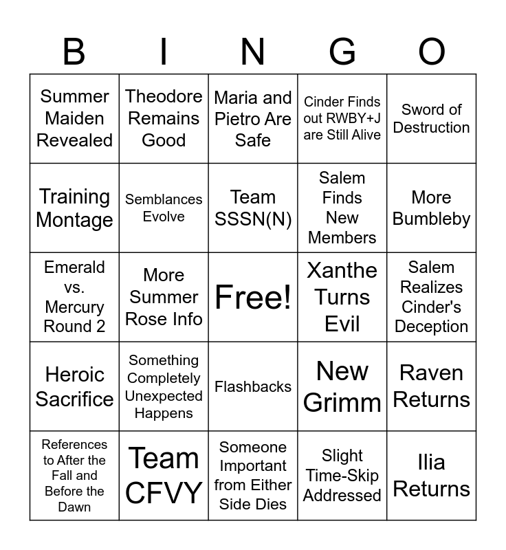 This bingo card has a free space and 24 words: Something Completely Unexpected Happens, Team CFVY, Team SSSN(N), References to After the Fall and Before the Dawn, Sword of Destruction, Summer Maiden Revealed, Training Montage, Theodore Remains Good, Xanthe Turns Evil, Flashbacks, Salem Finds New Members, Emerald vs. Mercury Round 2, New Grimm, Raven Returns, Semblances Evolve, Slight Time-Skip Addressed, Salem Realizes Cinder's Deception, Maria and Pietro Are Safe, More Bumbleby, More Summer Rose Info, Ilia Returns, Heroic Sacrifice, Cinder Finds out RWBY+J are Still Alive and Someone Important from Either Side Dies.