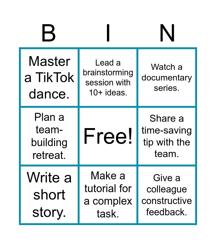 This bingo card has a free space and 30 words: Read a book in a week., Cook a three-course meal., Dance for 30 minutes straight., Take a selfie with a wild animal., Master a TikTok dance., Watch a documentary series., Write a short story., Build a piece of furniture., Take a photo every day for a week., Try a completely new look., Go 24 hours without technology., Write 10 things you're grateful for., Host a virtual trivia night., Learn a card trick., Create a playlist for every mood., Deliver a presentation without notes., Organize a virtual team-building event., Share a professional article with insights., Create a detailed project plan., Give a colleague constructive feedback., Host a virtual lunch and learn., Design an infographic., Lead a brainstorming session with 10+ ideas., Write a compelling email campaign., Share a time-saving tip with the team., Plan a team-building retreat., Create a motivational video for the team., Set an ambitious quarterly goal., Make a tutorial for a complex task. and Start a professional development group..