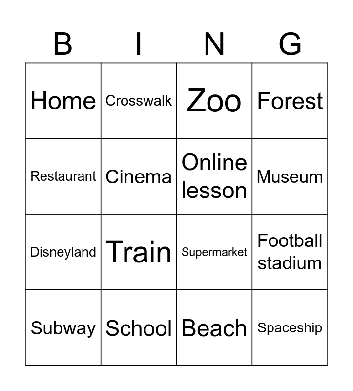 This bingo card has 16 words: School, Football stadium, Zoo, Home, Disneyland, Crosswalk, Supermarket, Beach, Restaurant, Cinema, Subway, Forest, Train, Museum, Online lesson and Spaceship.