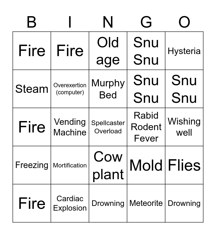 This bingo card has a free space and 43 words: Cow plant, Drowning, Electrocution, Fire, Starvation, Meteorite, Old age, Snu Snu, Hysteria, Cardiac Explosion, Snu Snu, Rabid Rodent Fever, Cow plant, Mortification, Electrocution, Drowning, Cow plant, Fire, Drowning, Snu Snu, Fire, Drowning, Electrocution, Fire, Wishing well, Wishing well, Cursed, Old age, Mold, Freezing, Lightning, Flies, Beetles, Vending Machine, Killer Chicken, Killer Rabbit, Killer Crow, Murphy Bed, Steam, Snu Snu, Spider, Overexertion (computer) and Over Heating.