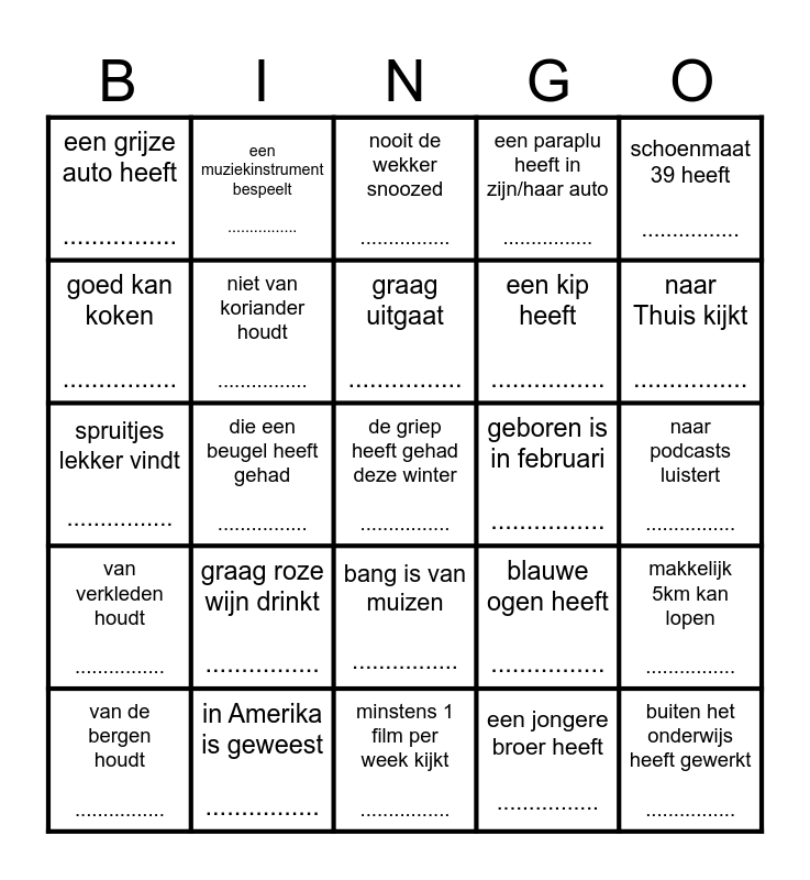 This bingo card has a free space and 24 words: graag roze wijn drinkt ................, in Amerika is geweest ................, graag uitgaat ................, van de bergen houdt ................, schoenmaat 39 heeft ................, een grijze auto heeft ................, goed kan koken ................, een muziekinstrument bespeelt ................, geboren is in februari ................, bang is van muizen ................, een kip heeft ................, spruitjes lekker vindt ................, blauwe ogen heeft ................, makkelijk 5km kan lopen ................, niet van koriander houdt ................, een jongere broer heeft ................, naar podcasts luistert ................, nooit de wekker snoozed ................, naar Thuis kijkt ................, die een beugel heeft gehad ................, buiten het onderwijs heeft gewerkt ................, van verkleden houdt ................, een paraplu heeft in zijn/haar auto ................ and minstens 1 film per week kijkt .................