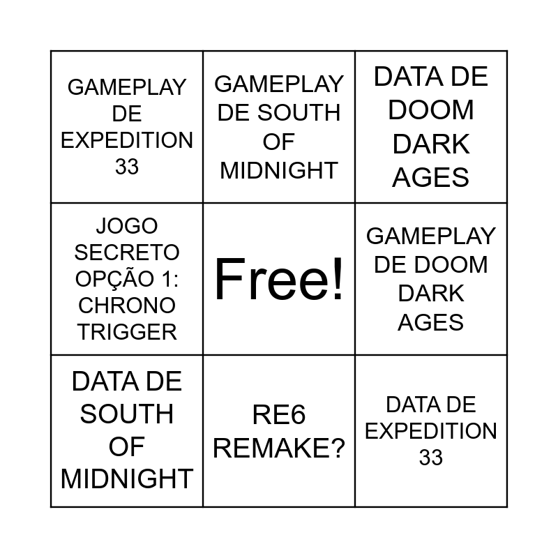 This bingo card has a free space and 8 words: GAMEPLAY DE DOOM DARK AGES, DATA DE DOOM DARK AGES, GAMEPLAY DE SOUTH OF MIDNIGHT, DATA DE SOUTH OF MIDNIGHT, GAMEPLAY DE EXPEDITION 33, DATA DE EXPEDITION 33, JOGO SECRETO OPÇÃO 1: CHRONO TRIGGER and RE6 REMAKE?.