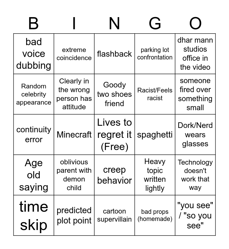 This bingo card has a free space and 44 words: dhar mann voiceover, "you see" / "so you see", merch in video, time skip, ps5, bad props (homemade), flashback, random expensive brand mentioned or named, dhar mann studios office in the video, predicted plot point, parking lot confrontation, spaghetti, creep behavior, oblivious parent with demon child, iPad Kid, cartoon supervillain, "it's like ____ always says...", continuity error, dhar mann mentioned, someone fired over something small, extreme coincidence, unreasonable mom, chill dad, bad voice dubbing, Bullied for something small, Dork/Nerd wears glasses, Unreasonable punishment, Person should be fired, Heavy topic written lightly, Age old saying, Cops don't act that way, Technology doesn't work that way, Roblox, Fortnite, Minecraft, Couple should be divorced, Problematic lesson, Creep behavior, Goody two shoes friend, Random celebrity appearance, Racist/Feels racist, Quick unjustified anger, Clearly in the wrong person has attitude and Dhar Car.