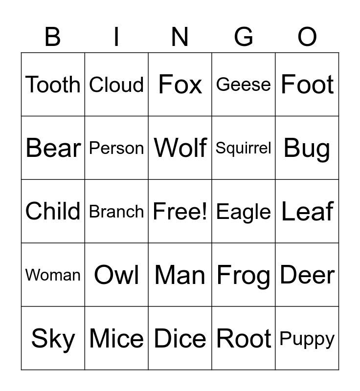 This bingo card has a free space and 24 words: Owl, Mice, Wolf, Sky, Foot, Tooth, Bear, Cloud, Eagle, Man, Squirrel, Child, Frog, Deer, Person, Root, Leaf, Fox, Bug, Branch, Puppy, Woman, Geese and Dice.