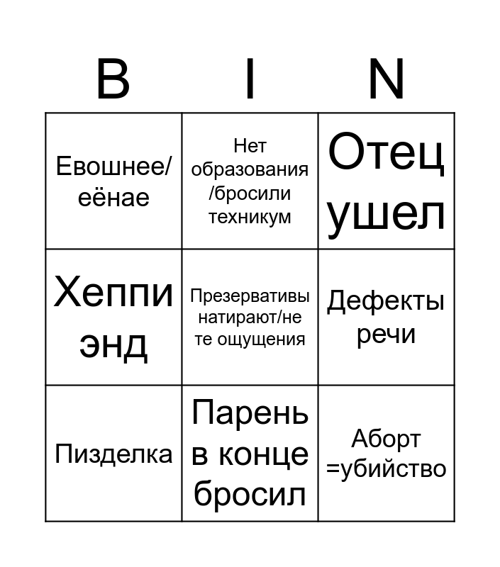 This bingo card has a free space and 8 words: Дефекты речи, Отец ушел, Нет образования /бросили техникум, Пизделка, Евошнее/еёнае, Аборт =убийство, Хеппи энд and Парень в конце бросил.