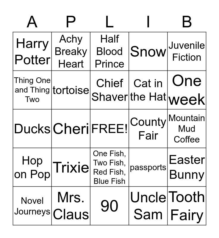 This bingo card has a free space and 31 words: 90, 3, Cheri, apples, Harry Potter, Half Blood Prince, tortoise, passports, County Fair, Uncle Sam, Mountain Mud Coffee, Tooth Fairy, Dr. Seuss, Two weeks, One week, 2008, Easter Bunny, Trixie, Hop on Pop, One Fish, Two Fish, Red Fish, Blue Fish, Juvenile Fiction, Juvenile DVD, Novel Journeys, Achy Breaky Heart, Cat in the Hat, Thing One and Thing Two, Snow, Ducks, Mrs. Claus, Chief Shaver and Shrek.