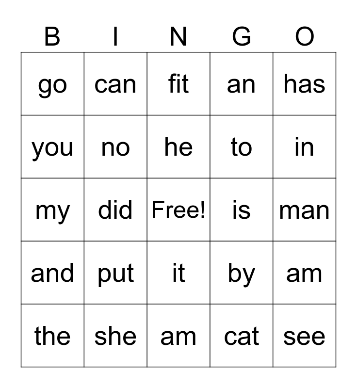 This bingo card has a free space and 24 words: put, she, he, the, has, go, you, can, is, it, to, my, by, am, no, cat, man, fit, in, did, see, and, an and am.