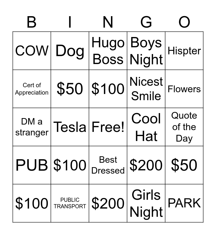 This bingo card has a free space and 25 words: $100, $200, $100, $100, Hispter, COW, Cert of Appreciation, Dog, Cool Hat, Best Dressed, Nicest Smile, DM a stranger, $200, $50, $50, Graffitti Mural, Quote of the Day, Hugo Boss, Flowers, Tesla, PARK, PUBLIC TRANSPORT, PUB, Boys Night and Girls Night.