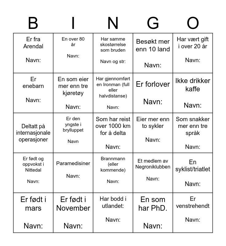 This bingo card has a free space and 24 words: Paramedisiner Navn:, Er født i November Navn:, Har gjennomført en Ironman (full eller halvdistanse) Navn:, Er født i mars Navn:, Har vært gift i over 20 år Navn:, Er fra Arendal Navn:, Er enebarn Navn:, En over 80 år Navn:, Eier mer enn to sykler Navn:, Brannmann (eller kommende) Navn:, Er forlover Navn:, Deltatt på internasjonale operasjoner, Et medlem av Negroniklubben Navn:, En syklist/triatlet Navn:, En som eier mer enn tre kjøretøy Navn:, En som har PhD. Navn:, Som snakker mer enn tre språk Navn:, Har samme skostørrelse som bruden Navn og str:, Ikke drikker kaffe Navn:, Er den yngste i brylluppet Navn, Er venstrehendt Navn:, Er født og oppvokst i Nittedal Navn:, Besøkt mer enn 10 land Navn: and Har bodd i utlandet: Navn:.