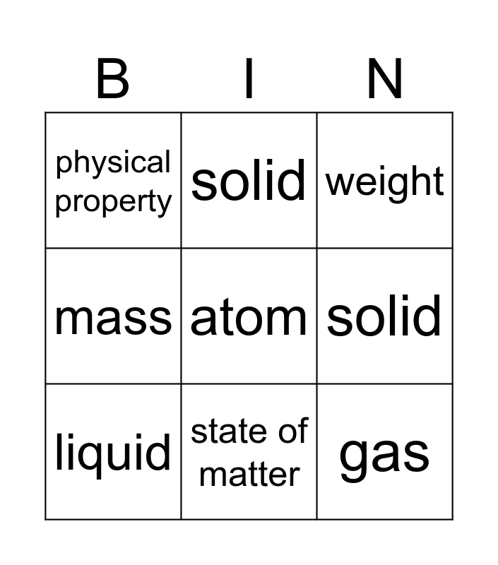 This bingo card has 14 words: matter, atom, gas, mass, solid, weight, state of matter, physical property, liquid, physical property, state of matter, solid, liquid and gas.