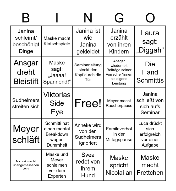 This bingo card has a free space and 24 words: Schmitti hat einen mental Breakdown wegen Dummheit, Maske und Meyer schleimen vor dem Experten, Seminarleitung steckt den Kopf durch die Tür, Nicolai macht unangemessenen Witz, Laura sagt: „Diggah“, Janina schleimt/ beschönigt Dinge, Ansgar dreht Bleistift, Maske macht Klatschspiele, Meyer macht Raucherpause, Anneke wird von den Sudheimers ignoriert, Ansgar wiederholt Beiträge seiner Vorredner*innen als eigene Leistung, Sudheimers streiten sich, Familaverbot in der Mittagspause, Luca drückt sich erfolgreich vor einer Aufgabe, Maske sagt: „Jaaaa! Spannend!“, Maske spricht Nicolai an, Janina schließt von sich aufs Seminar, Janina ist wie Janina gekleidet, Die Hand Schmittis, Viktorias Side Eye, Maske macht Frettchen, Meyer schläft, Janina erzählt von ihren Kindern and Svea redet von ihrem Hund.