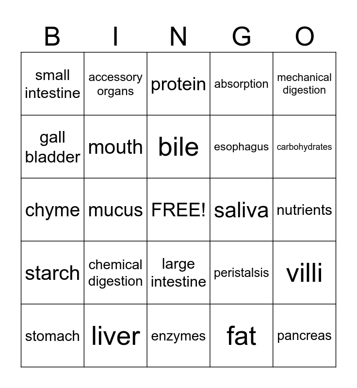 This bingo card has a free space and 24 words: chemical digestion, liver, bile, stomach, mechanical digestion, small intestine, gall bladder, accessory organs, saliva, large intestine, esophagus, chyme, peristalsis, villi, mouth, fat, nutrients, protein, carbohydrates, mucus, pancreas, starch, absorption and enzymes.