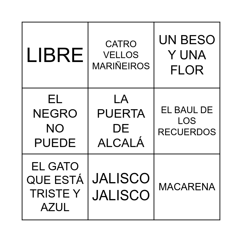 This bingo card has 48 words: A CABRITINHA, A RIANXEIRA, BIMBÓ 92, CAMINO VERDE, CÁNTAME, CARMIÑA, CARMELA, CATRO VELLOS MARIÑEIROS, CATRO VELLOS MARIÑEIROS, EL BAUL DE LOS RECUERDOS, EL CHIRINGUITO, EL GATO QUE ESTÁ TRISTE Y AZUL, EL NEGRO NO PUEDE, EL POROMPOMPERO, EL REY, ESCÁNDALO, FIERA INQUIETA, JALISCO JALISCO, LA BARBACOA, LA DISTANCIA, LA PUERTA DE ALCALÁ, LA QUIERO A MORIR, LA VIDA PASA FELIZMENTE, LIBRE, MACARENA, MARINERO DE LUCES, MI CARRO, MI CASITA DE PAPEL, MI GRAN NOCHE, MUIÑEIRA DE CHANTADA, NOCHES DE BODA, NOELIA, O GATO, PALOMA BLANCA, POR LA RAJA DE TU FALDA, POUSA, POUSA, RATA DE DOS PATAS, RESISTIRÉ, ROMEO Y JULIETA, SE ME ENAMORA EL ALMA, SEVILLA TIENE UN COLOR ESPECIAL, SIN TI NO SOY NADA, SON TUS PERFUMENES MUJER, UN BESO Y UNA FLOR, UNA ROSA ES UNA ROSA, VIVIR ASÍ ES MORIR DE AMOR, YO NO TE PIDO LA LUNA, YO SOY AQUÉL and YOLANDA.