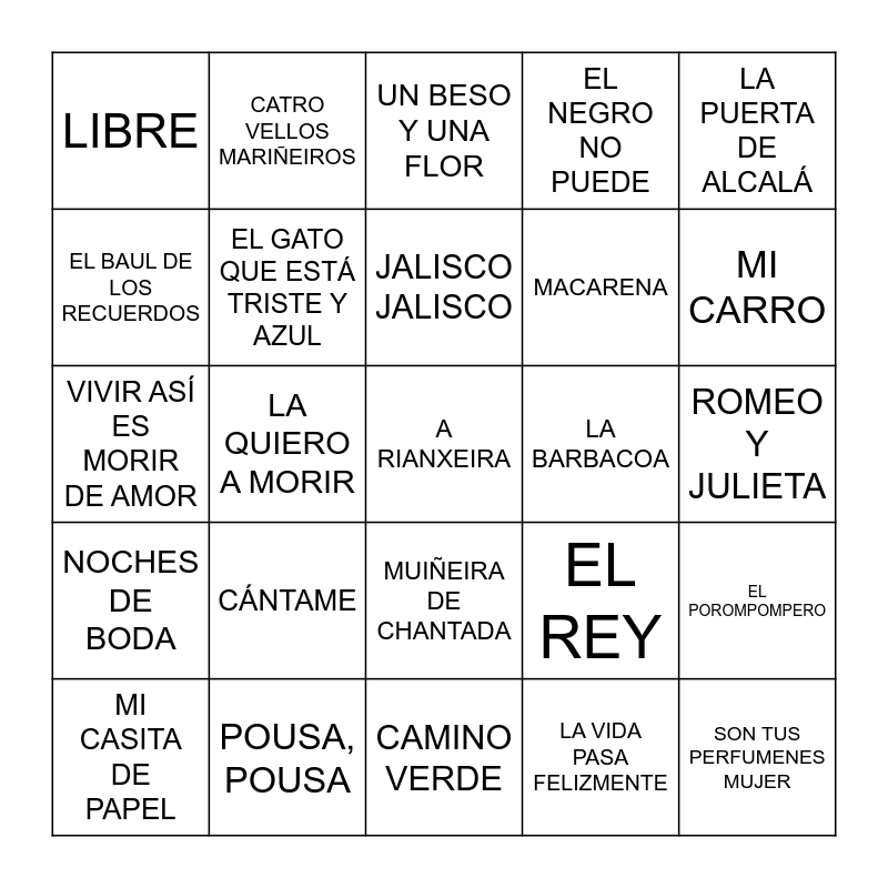 This bingo card has 48 words: A CABRITINHA, A RIANXEIRA, BIMBÓ 92, CAMINO VERDE, CÁNTAME, CARMIÑA, CARMELA, CATRO VELLOS MARIÑEIROS, CATRO VELLOS MARIÑEIROS, EL BAUL DE LOS RECUERDOS, EL CHIRINGUITO, EL GATO QUE ESTÁ TRISTE Y AZUL, EL NEGRO NO PUEDE, EL POROMPOMPERO, EL REY, ESCÁNDALO, FIERA INQUIETA, JALISCO JALISCO, LA BARBACOA, LA DISTANCIA, LA PUERTA DE ALCALÁ, LA QUIERO A MORIR, LA VIDA PASA FELIZMENTE, LIBRE, MACARENA, MARINERO DE LUCES, MI CARRO, MI CASITA DE PAPEL, MI GRAN NOCHE, MUIÑEIRA DE CHANTADA, NOCHES DE BODA, NOELIA, O GATO, PALOMA BLANCA, POR LA RAJA DE TU FALDA, POUSA, POUSA, RATA DE DOS PATAS, RESISTIRÉ, ROMEO Y JULIETA, SE ME ENAMORA EL ALMA, SEVILLA TIENE UN COLOR ESPECIAL, SIN TI NO SOY NADA, SON TUS PERFUMENES MUJER, UN BESO Y UNA FLOR, UNA ROSA ES UNA ROSA, VIVIR ASÍ ES MORIR DE AMOR, YO NO TE PIDO LA LUNA, YO SOY AQUÉL and YOLANDA.