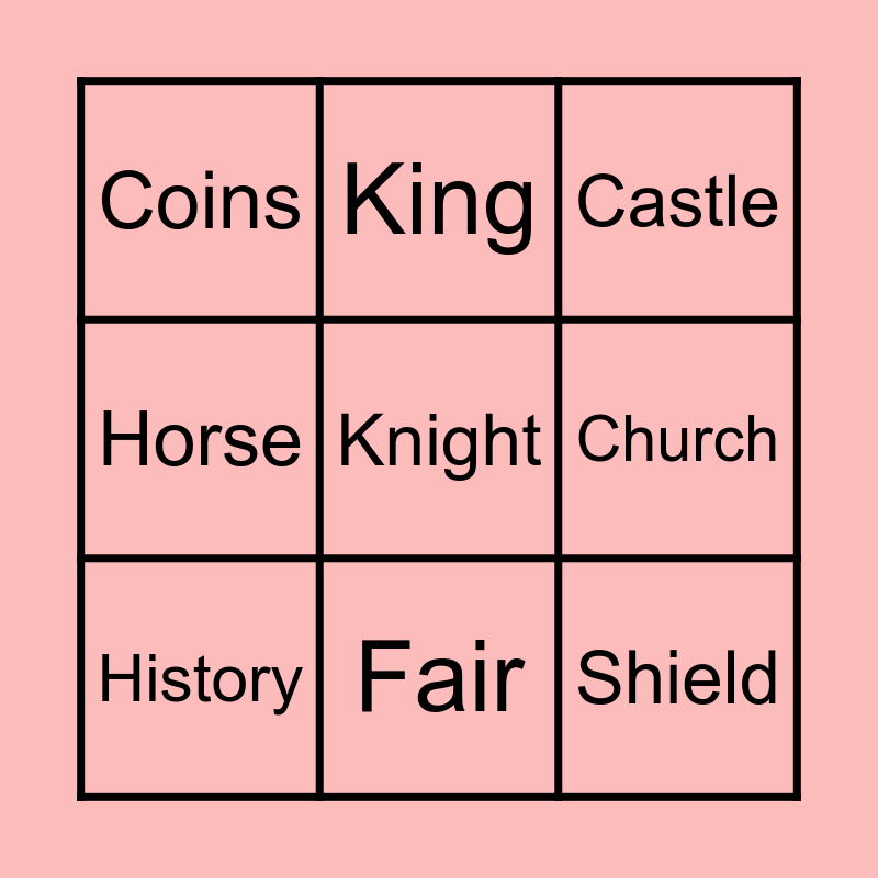 This bingo card has a free space and 19 words: Free!, Princess, Castle, Kingdom, Sword, Shield, Thief, Coins, King, Queen, Prince, Church, History, Past, Nobility, Peasants, Horse, Fair and Tournament.
