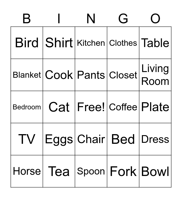This bingo card has a free space and 29 words: Horse, Cow, Cat, Dog, Bird, Kitchen, Cook, Eggs, Coffee, Tea, Plate, Bowl, Spoon, Fork, Living Room, Couch, Chair, TV, Table, Bedroom, Bed, Sleep, Closet, Blanket, Clothes, Shirt, Dress, Pants and Skirt.
