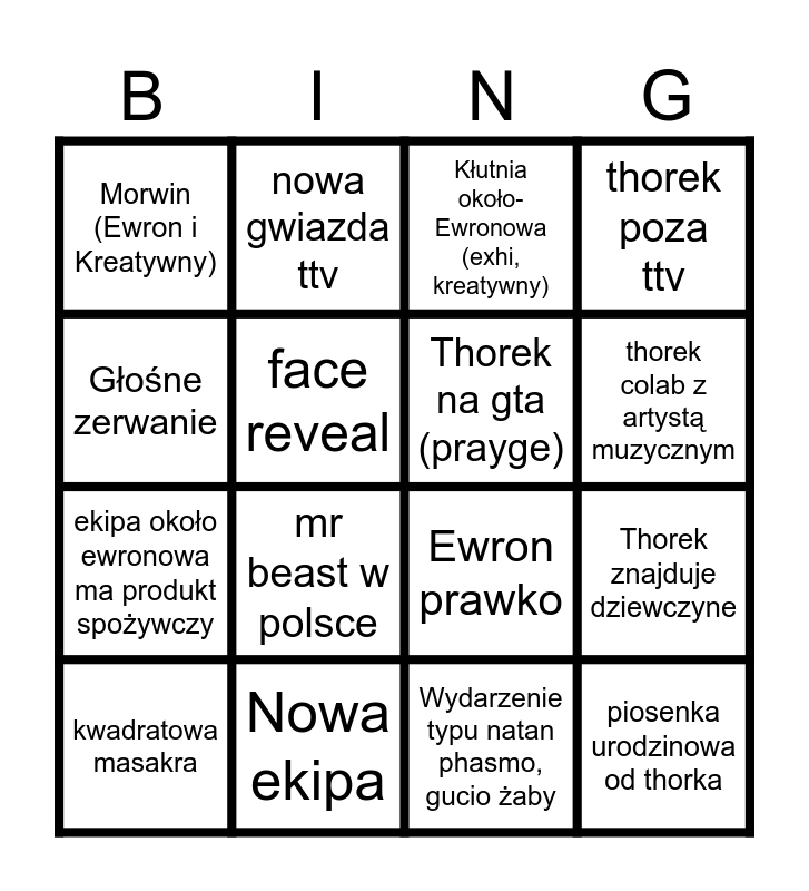 This bingo card has 16 words: Nowa ekipa, Thorek znajduje dziewczyne, Kłutnia około- Ewronowa (exhi, kreatywny), Morwin (Ewron i Kreatywny), ekipa około ewronowa ma produkt spożywczy, nowa gwiazda ttv, Ewron prawko, Wydarzenie typu natan phasmo, gucio żaby, Głośne zerwanie, face reveal, kwadratowa masakra, thorek poza ttv, mr beast w polsce, thorek colab z artystą muzycznym, Thorek na gta (prayge) and piosenka urodzinowa od thorka.