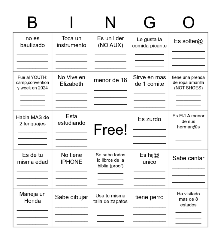 This bingo card has a free space and 29 words: Maneja un Honda __________ __________ __________, Tiene mas de $10 cash (proof) __________ __________ __________, Esta estudiando __________ __________ __________, Juega algun deporte __________ __________ __________, no es bautizado __________ __________ __________, Es un lider (NO AUX) __________ __________ __________, No Vive en Elizabeth __________ __________ __________, No tiene IPHONE __________ __________ __________, Es zurdo __________ __________ __________, Sabe dibujar __________ __________ __________, Es El/LA menor de sus herman@s __________ __________ __________, Ha visitado mas de 8 estados __________ __________ __________, Usa tu misma talla de zapatos __________ __________ __________, tiene perro __________ __________ __________, tiene una prenda de ropa amarilla (NOT SHOES) __________ __________ __________, halla viajado a mas de 3 paises __________ __________ __________, Se sabe todos lo libros de la biblia (proof) __________ __________ __________, Es de tu misma edad __________ __________ __________, Es solter@ __________ __________ __________, Habla MAS de 2 lenguajes __________ __________ __________, Es hij@ unico __________ __________ __________, Es El/LA mayor de sus herman@s __________ __________, Sirve en mas de 1 comite __________ __________ __________, Fue al YOUTH: camp,convention y week en 2024 __________ __________ __________, Le gusta la comida picante __________ __________ __________, Toca un instrumento __________ __________ __________, Sabe cantar __________ __________ __________, menor de 18 __________ __________ __________ and tiene hij@s __________ __________ __________.