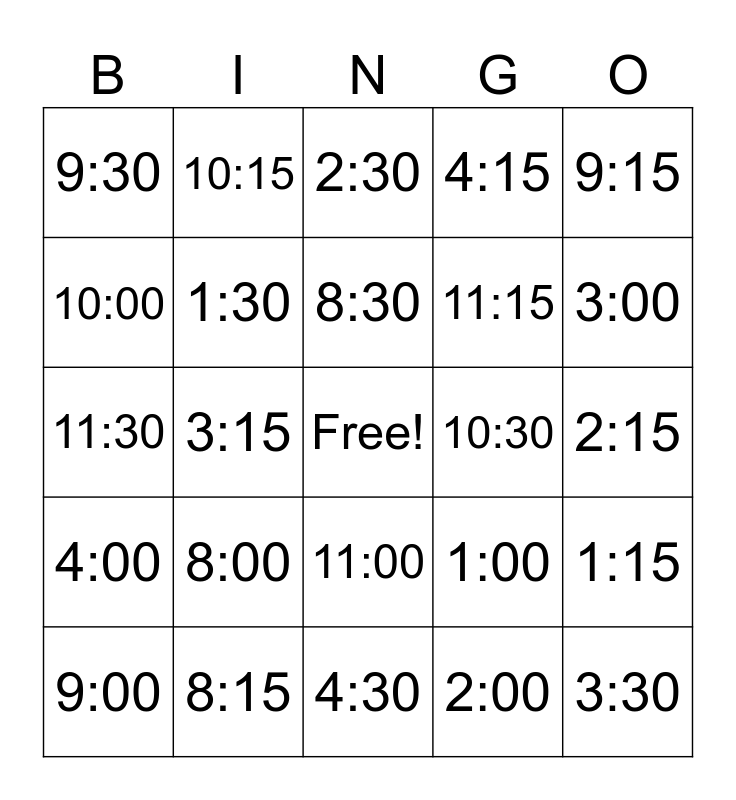 This bingo card has a free space and 24 words: 8:00, 8:15, 8:30, 9:00, 9:15, 9:30, 10:00, 10:15, 10:30, 11:00, 11:15, 11:30, 1:00, 1:15, 1:30, 2:00, 2:15, 2:30, 3:00, 3:15, 3:30, 4:00, 4:15 and 4:30.