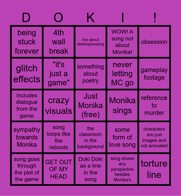 This bingo card has a free space and 24 words: song loops like the reboots, GET OUT OF MY HEAD, something about poetry, song goes through the plot of the game, obsession, being stuck forever, glitch effects, 4th wall break, Monika sings, the classroom in the background, never letting MC go, includes dialogue from the game, some form of love song, characters are just images and not animated, "it's just a game", song shows any perspective besides Monika's, reference to murder, line about deleting/erasing, gameplay footage, crazy visuals, torture line, sympathy towards Monika, WOW! A song not about Monika! and Doki Doki as a line in the song.