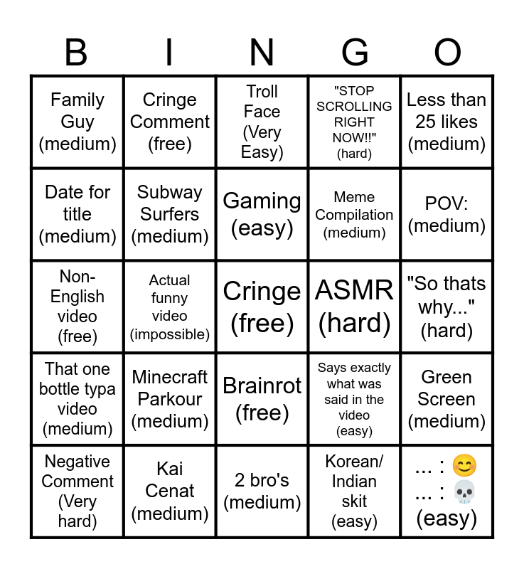 This bingo card has 40 words: Oogway Video (medium), Non-English video (free), Reddit Story (medium), Subway Surfers (medium), Kai Cenat (medium), Brainrot (free), Gaming (easy), Animation (easy), Less than 25 likes (medium), That one bottle typa video (medium), Actual funny video (impossible), "STOP SCROLLING RIGHT NOW!!" (hard), Cringe (free), "So thats why..." (hard), ASMR (hard), Minecraft Parkour (medium), Movie Clip (easy), Family Guy (medium), Edit (easy), Troll Face (Very Easy), Green Screen (medium), Korean/ Indian skit (easy), Meme Compilation (medium), Date for title (medium), Scam (hard), At least 3 😂/😭/🎉 (easy), 🗿 (medium), 🤖 Bot (hard), ... : 😊 ... : 💀 (easy), ❌ ✅ (easy), Funny Comment (Impossible), Negative Comment (Very hard), We _ with this one 🗣️🔥 (medium), Says exactly what was said in the video (easy), POV: (medium), 2 bro's (medium), Like beggar (easy), 👇 (free), Cringe Comment (free) and edit: MOM IM FAMOUS (free).