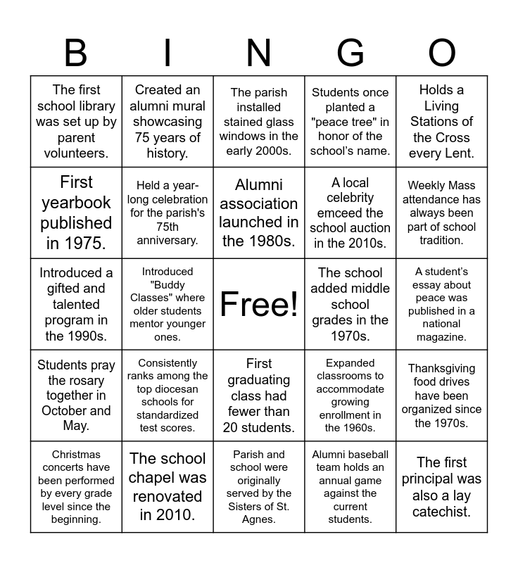 This bingo card has a free space and 96 words: School was founded in 1949., Named "Our Lady Queen of Peace" after a Marian title., Parish was established before the school opened., The school added middle school grades in the 1970s., Hosted the first Christmas concert in the parish hall in 1955., Original mascot was a dove., Annual Auction began in the 1990s., First principal served for 15 years., 50th anniversary was celebrated in 1999., Current mascot is the Crusader., Famous alumni have included local community leaders., Longest-serving teacher taught for 40 years., School's athletic program started with just basketball., Weekly Mass attendance has always been part of school tradition., Added STEM curriculum in the 2010s., First yearbook published in 1975., Alumni association launched in the 1980s., School choir performed at a diocesan event in 2000., The parish hosted a "Night in Bethlehem" for the first time in 2024., First computer lab installed in the 1980s., Added a Spanish language program in the early 2000s., Students made their own float for the 1999 community parade., Parish center renovation included updates to the school cafeteria., Hosted state championship teams in the 1980s., First graduating class had fewer than 20 students., Parish and school were originally served by the Sisters of St. Agnes., New gymnasium was built in the 1990s., The first school library was set up by parent volunteers., Original classrooms had chalkboards; whiteboards replaced them in the 2000s., Celebrated the 75th anniversary in 2024 with a gala event., Hosted a diocesan-wide education conference in the 1980s., Expanded classrooms to accommodate growing enrollment in the 1960s., First uniforms were introduced in the 1950s., Annual May Crowning is one of the longest-standing traditions., Holds a Living Stations of the Cross every Lent., Every year, 8th graders take a special trip before graduation., Thanksgiving food drives have been organized since the 1970s., The school bell tower has been featured in holiday postcards., Hosts a student art show during Catholic Schools Week., Introduced "Buddy Classes" where older students mentor younger ones., The spelling bee has been a staple event for decades., Christmas concerts have been performed by every grade level since the beginning., The first principal was also a lay catechist., The school chapel was renovated in 2010., Students pray the rosary together in October and May., The parish installed stained glass windows in the early 2000s., Celebrates All Saints Day with costumes and classroom activities., Annual school theme is tied to a Catholic virtue., A former student became a principal at the school., Alumni include a state senator and a college football coach., A former teacher was recognized as a Diocesan Educator of the Year., Longest-serving pastor of the parish was also a frequent visitor to classrooms., Robotics Club started in 2018., School launched a 1:1 iPad program in 2021., Participates in the Diocesan Spelling and Math Competitions annually., Introduced a music program with recorders in the 4th grade., First science fair was held in 1978., The parish was originally a mission church before becoming a full parish., The first school building only had three classrooms., Added air conditioning to classrooms in the 2000s., First school bus service began in the 1960s., The original church doubled as the school gymnasium., A fire drill in the 1980s made it into the local news for its efficiency., Added a preschool program in the early 2010s., Renovation of the playground was a community project in the 1990s., Celebrated the parish’s centennial alongside the school’s anniversary., Girls' volleyball team won a diocesan championship in the 1980s., Introduced chess club in the 1990s., Hosted a talent show fundraiser for the first time in 2001., Alumni baseball team holds an annual game against the current students., Basketball was the first competitive sport offered by the school., A student-athlete once went on to play professionally in the NBA., First drama production was The Sound of Music in the 1980s., Choir has performed at the Wisconsin State Capitol., Students have participated in National History Day projects since the 2000s., The school survived a major snowstorm in the 1970s without missing a day of class., Hosted a bishop’s visit for confirmation in the early 2000s., Held a year-long celebration for the parish's 75th anniversary., A time capsule from the 25th anniversary was opened at the 50th anniversary celebration., A local celebrity emceed the school auction in the 2010s., Students once planted a "peace tree" in honor of the school’s name., The parish hall hosted the first school picnic in 1951., A parish priest started an after-school chess club in the 1970s., The annual parish festival funds scholarships for students., Held a joint school and parish retreat during Lent for the first time in 2019., Introduced a gifted and talented program in the 1990s., Consistently ranks among the top diocesan schools for standardized test scores., Partnered with a local university for science mentorship programs., Students wrote letters that were sent to Pope Francis during his visit to the U.S. in 2015., A student’s essay about peace was published in a national magazine., Hosted a spelling bee champion who went on to nationals., Alumni established a scholarship fund in honor of former teachers., A student group started a recycling program in the 2000s., Students built a peace garden on campus as part of an Earth Day project., Created an alumni mural showcasing 75 years of history. and A former student designed the school’s current logo..