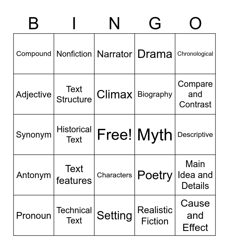 This bingo card has a free space and 29 words: Noun, Technical Text, Narrator, Fantasy, Chronological, Compound, Text Structure, Climax, Myth, Main Idea and Details, Pronoun, Historical Text, Realistic Fiction, Cause and Effect, Synonym, Main Idea, Setting, Poetry, Compare and Contrast, Antonym, Text features, Theme, Biography, Descriptive, Adjective, Nonfiction, Characters, Drama and Problem and Solution.