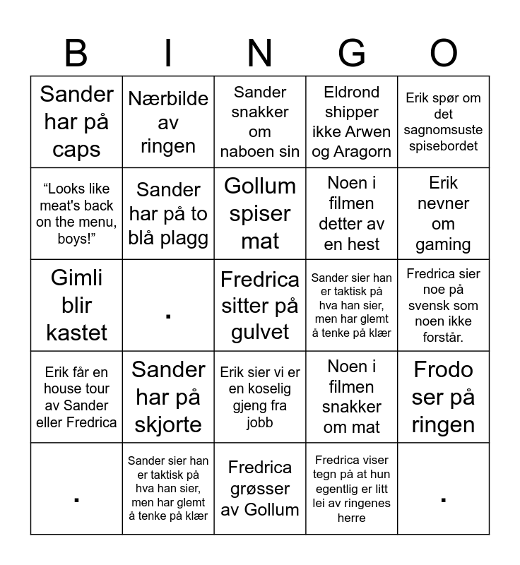 This bingo card has 29 words: ., ., ., ., Sander har på caps, Sander snakker om naboen sin, Sander har på to blå plagg, Sander har på skjorte, Sander sier han er taktisk på hva han sier, men har glemt å tenke på klær, Sander sier han er taktisk på hva han sier, men har glemt å tenke på klær, Fredrica sier noe på svensk som noen ikke forstår., Fredrica sitter på gulvet, Fredrica grøsser av Gollum, Fredrica viser tegn på at hun egentlig er litt lei av ringenes herre, Erik nevner om gaming, Erik har på band t-skjorte, Erik sier vi er en koselig gjeng fra jobb, Erik får en house tour av Sander eller Fredrica, Erik spør om det sagnomsuste spisebordet, Gimli blir kastet, Noen i filmen snakker om mat, Noen i filmen blir minnet på sitt eget navn, Noen i filmen detter av en hest, “Looks like meat's back on the menu, boys!”, Eldrond shipper ikke Arwen og Aragorn, Nærbilde av ringen, Frodo ser på ringen, Gollum spiser mat and Eye of Sauron.