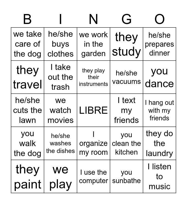This bingo card has a free space and 30 words: we play, we cook, we watch movies, we wash the cars, we take care of the dog, we work in the garden, I take out the trash, I organize my room, I text my friends, I use the computer, I hang out with my friends, I listen to music, you sunbathe, you talk on the phone, you dance, you clear the table, you clean the kitchen, you walk the dog, he/she washes the dishes, he/she prepares dinner, he/she cuts the lawn, he/she sings, he/she buys clothes, he/she vacuums, they travel, they study, they do the laundry, they paint, they play their instruments and they ride their bikes.