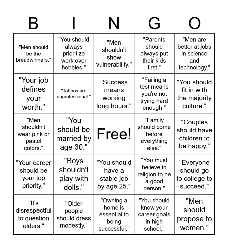 This bingo card has a free space and 40 words: "Women should wear makeup to look professional.", "Men shouldn't wear pink or pastel colors.", "You should stay thin to be attractive.", "Tattoos are unprofessional.", "Older people should dress modestly.", "You should have a stable job by age 25.", "Success means working long hours.", "Women are better at caregiving jobs.", "Men are better at jobs in science and technology.", "Your career should be your top priority.", "You should be married by age 30.", "Parents should always put their kids first.", "Men should propose to women.", "Couples should have children to be happy.", "Family should come before everything else.", "Boys shouldn't play with dolls.", "Girls are naturally better at cooking.", "Men should be the breadwinners.", "Women should stay at home to raise children.", "Men shouldn't show vulnerability.", "Everyone should go to college to succeed.", "You should know your career goals in high school.", "Failing a test means you're not trying hard enough.", "Your job defines your worth.", "Being smart means being good at math or science.", "You should always be polite, even if you're upset.", "It's rude to say 'no' to invitations.", "Talking about mental health is taboo.", "You should always be outgoing to make friends.", "Crying in public is embarrassing.", "You should follow your family traditions.", "It's disrespectful to question elders.", "Everyone should celebrate holidays the same way.", "You must believe in religion to be a good person.", "You should fit in with the majority culture.", "Owning a home is essential to being successful.", "Traveling is a luxury, not a necessity.", "People shouldn't live alone.", "You should always prioritize work over hobbies." and "Your lifestyle should match your income.".