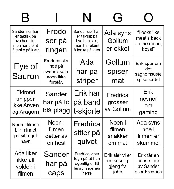 This bingo card has 30 words: Sander har på caps, Sander snakker om naboen sin, Sander har på to blå plagg, Sander har på skjorte, Sander sier han er taktisk på hva han sier, men har glemt å tenke på klær, Sander sier han er taktisk på hva han sier, men har glemt å tenke på klær, Fredrica sier noe på svensk som noen ikke forstår., Fredrica sitter på gulvet, Fredrica grøsser av Gollum, Fredrica viser tegn på at hun egentlig er litt lei av ringenes herre, Erik nevner om gaming, Erik har på band t-skjorte, Erik sier vi er en koselig gjeng fra jobb, Erik får en house tour av Sander eller Fredrica, Erik spør om det sagnomsuste spisebordet, Gimli blir kastet, Noen i filmen snakker om mat, Noen i filmen blir minnet på sitt eget navn, Noen i filmen detter av en hest, “Looks like meat's back on the menu, boys!”, Eldrond shipper ikke Arwen og Aragorn, Nærbilde av ringen, Frodo ser på ringen, Gollum spiser mat, Eye of Sauron, Ada syns Gollum er ekkel, Ada syns noe i filmen er skummel, Ada liker ikke all volden i filmen, Ada har på striper and Ada tilbyr seg å sitte på gulvet.